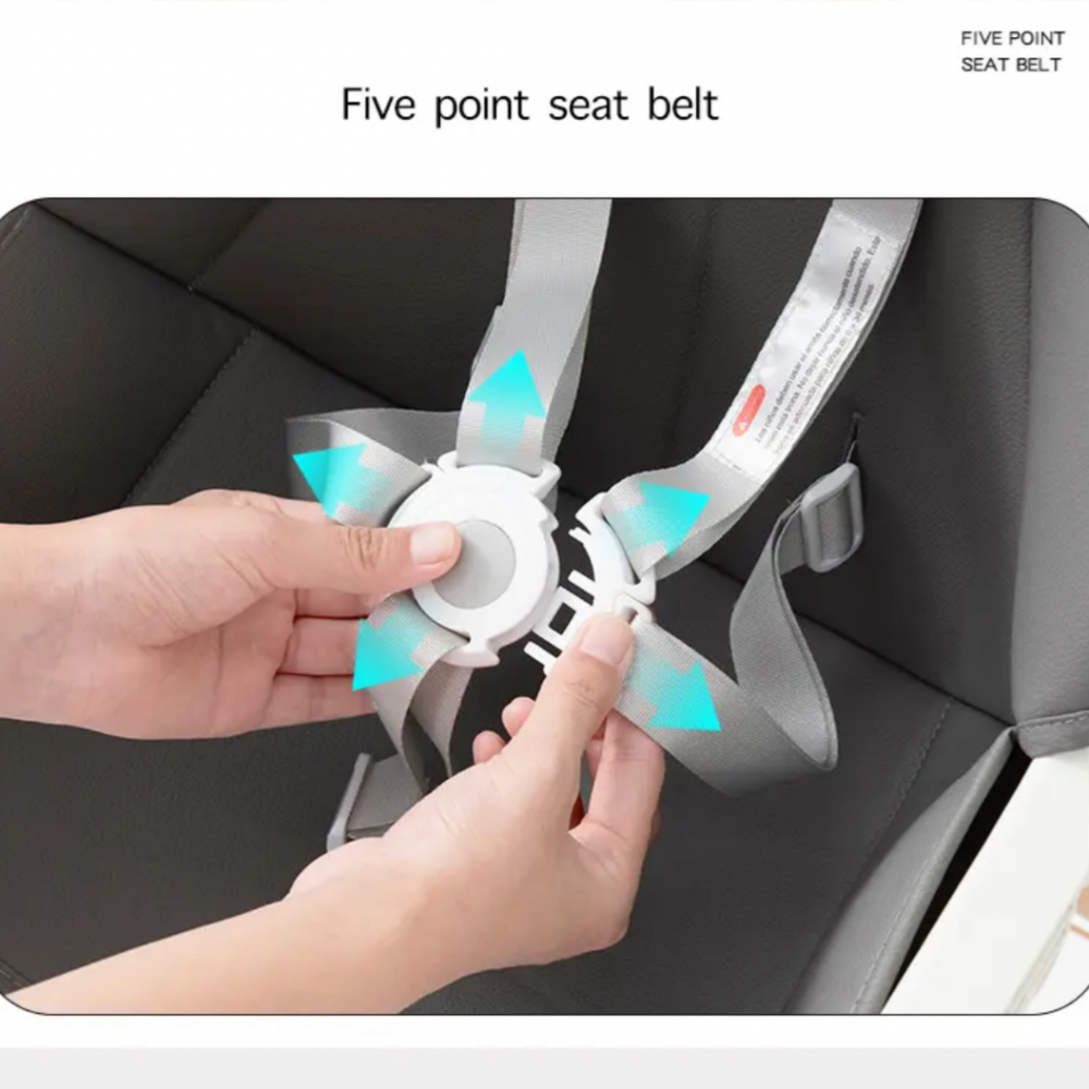 مجهز بحزام من 5 نقاط ومقابس مانعة للانزلاق في الجزء السفلي من الكرسي المرتفع.