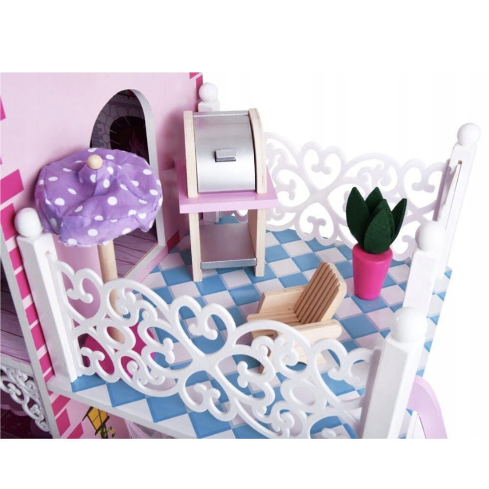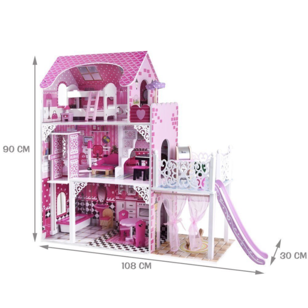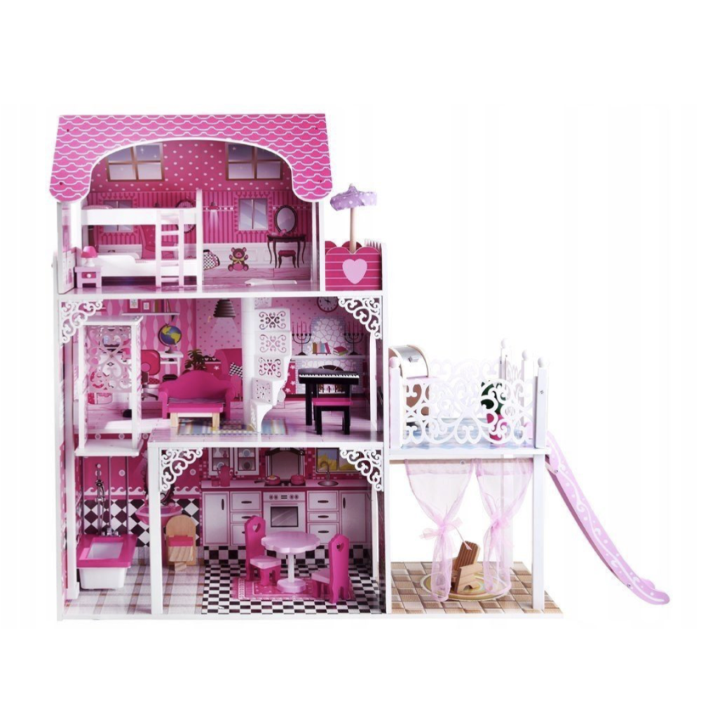 يعد بيت الدمى الخشبي المجهز بالكامل أمرًا ضروريًا لكل غرفة سيدة شابة. اللعب مع العائلة واللعب بالدمى هو أحد وسائل التسلية المفضلة لدى الفتيات الصغيرات. تتيح لك اللعبة بناء منزلك الفريد، والذي يمكن للطفل تزيينه حسب ذوقه الخاص. بناء المنزل ذكي وذكي للغاية. يمكن أن يكون المنزل زخرفة جميلة لغرفة الأميرة الصغيرة. يتميز المنزل بمظهره الحديث والمحافظ والأصلي بالإضافة إلى مفروشاته الغنية. غرفة المعيشة: - الطابق الأرضي (مطبخ مع غرفة طعام، تراس ساحر مع ستائر وردية، حمام مع حوض استحمام ومرحاض) - الطابق الأول (مكتب، غرفة معيشة مع مدفأة، تراس مع منزلق، سلم مفتوح) - طابق العلية (غرفة أطفال، شرفة) ) أبعاد المنزل: - الارتفاع الإجمالي 90 سم - العمق 30 سم - العرض 108 سم - الارتفاع في الطابق الأرضي والعلية: 29 سم - الارتفاع في الطابق الأول 25.5 سم الأثاث: - ارتفاع السرير 18.5 × الطول 24، العرض 10.5 سم - طول الانزلاق 38.5 سم - عرض الانزلاق 5.5 سم معدات المنزل: أريكة مقعد 2 × كراسي طاولة مستديرة بيانو كرسي بيانو سرير مزدوج بطابقين سلم سرير طاولة بجانب السرير مصباح بجانب السرير عاكس الضوء قائم للحمام مرحاض كرسي بذراعين شواية مظلة زهرة في ستائر وعاء انزلاقية